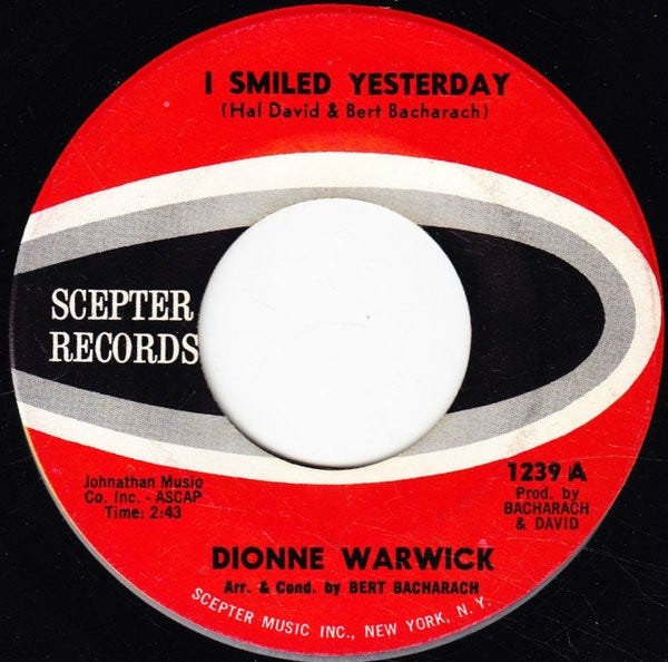 If…the original 45 with “I Smiled Yesterday” as the ‘A’ side hadn’t made any impact at radio and Scepter decided to flip it and “Don’t Make Me Over” became the topside and subsequently by January 1963 started its’ climb into the US R&B Top 10 and Top 30 charts and Dionne Warwick’s recording career began in earnest…