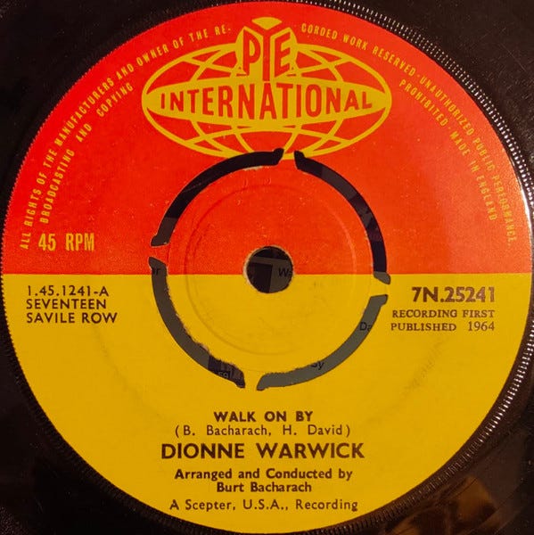If…on May 7th 1964, “Walk On By” became a Top 10 hit in the UK and on May 23rd. Pye hadn’t released a composite album, “Presenting Dionne Warwick” and Mrs. Frances Nathan, my Mother hadn’t given in to my begging her for the then-massive sum of 1 pound, 13 shillings & six pence to buy the LP from Musicland (the record shop on Willesden Lane round the corner from where we lived above Crusoe’s, the fish and chip shop my Dad managed at which I would work on Saturday mornings to earn pocket money)…